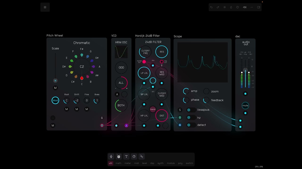 Here’s a take on Rob Hordijk’s 24dB Filter – the last in my series of Audulus versions of his modules.