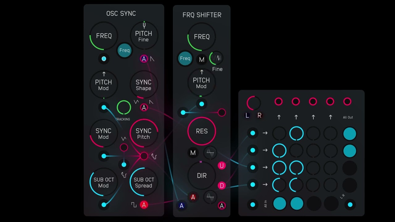 Here’s the classic frequency shifter ‘barber pole’ effect. The direction can be changed with the up/down knob. The adding delay to the feedback chain can add to the effect.