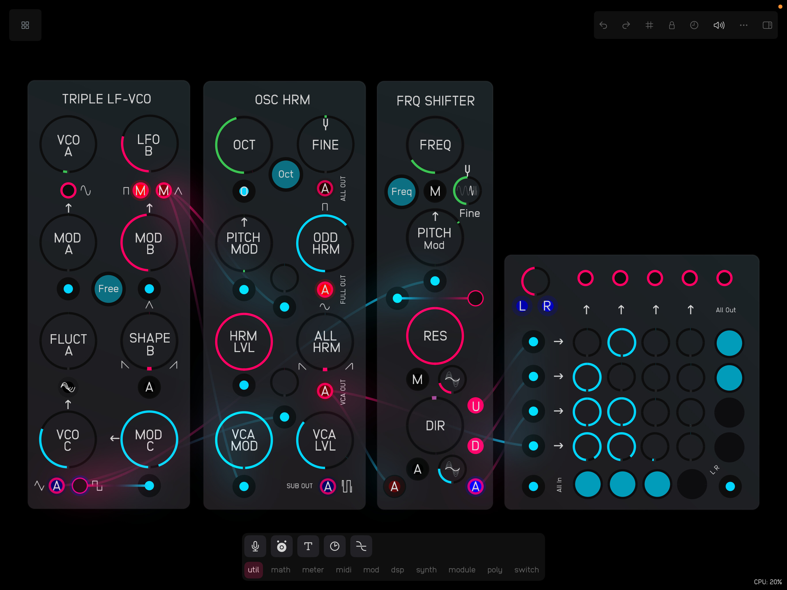 The all-pass filter is something that Hordijk covers succinctly in his video on the Physics of Sound, and I’d already made one while putting together an Audulus version of his Phaser. While Hordijk provides a good explanation of the principles behind the frequency shifter and a thorough demonstration of his own module, I needed to do a little detective work before I could figure out what was going on with the filter network .