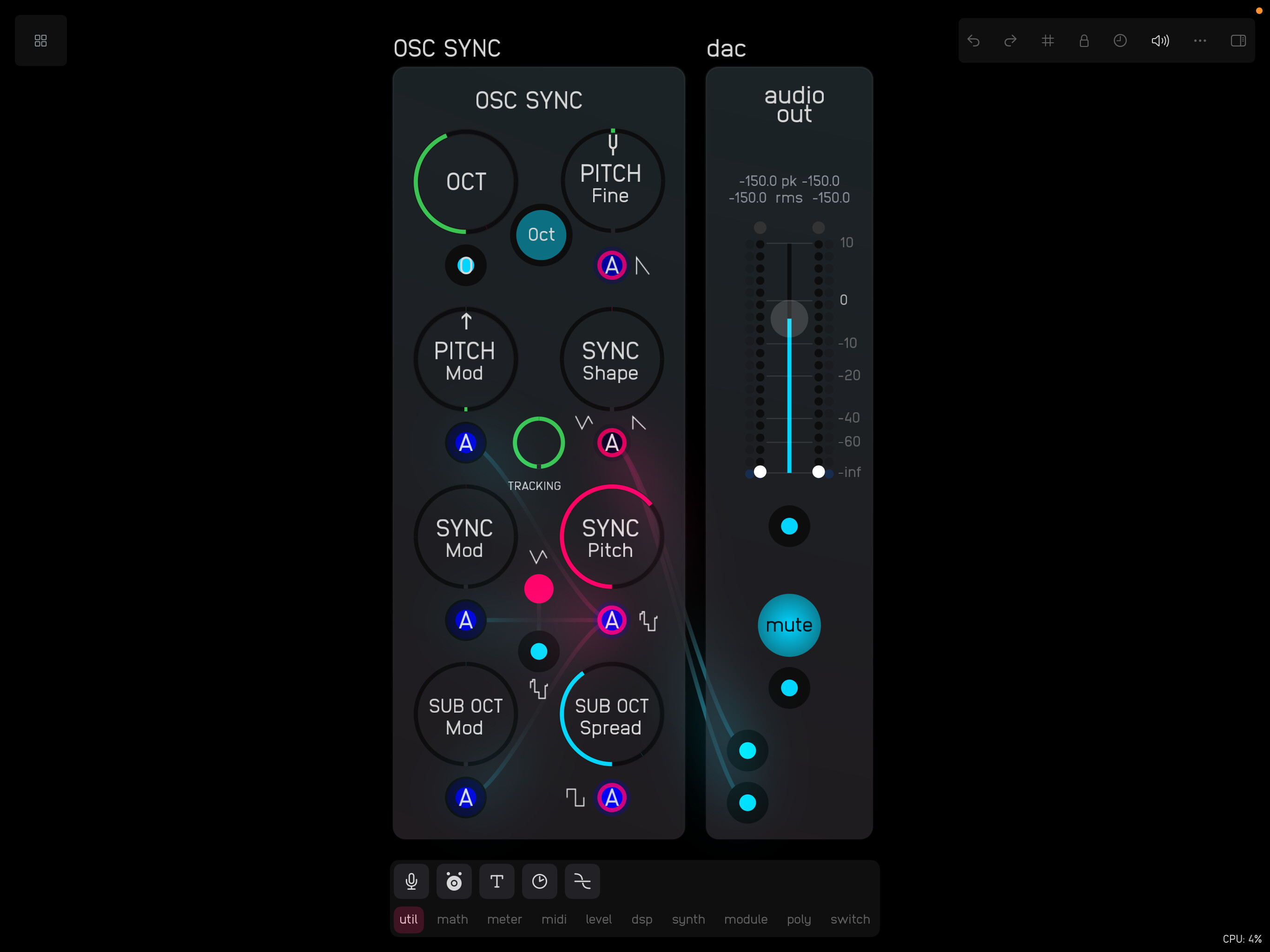 (I experimented a little with tracking between the syncing and synced oscillators, but have left it out for now – the Audulus version seems simpler to use and I was having more fun without it.)